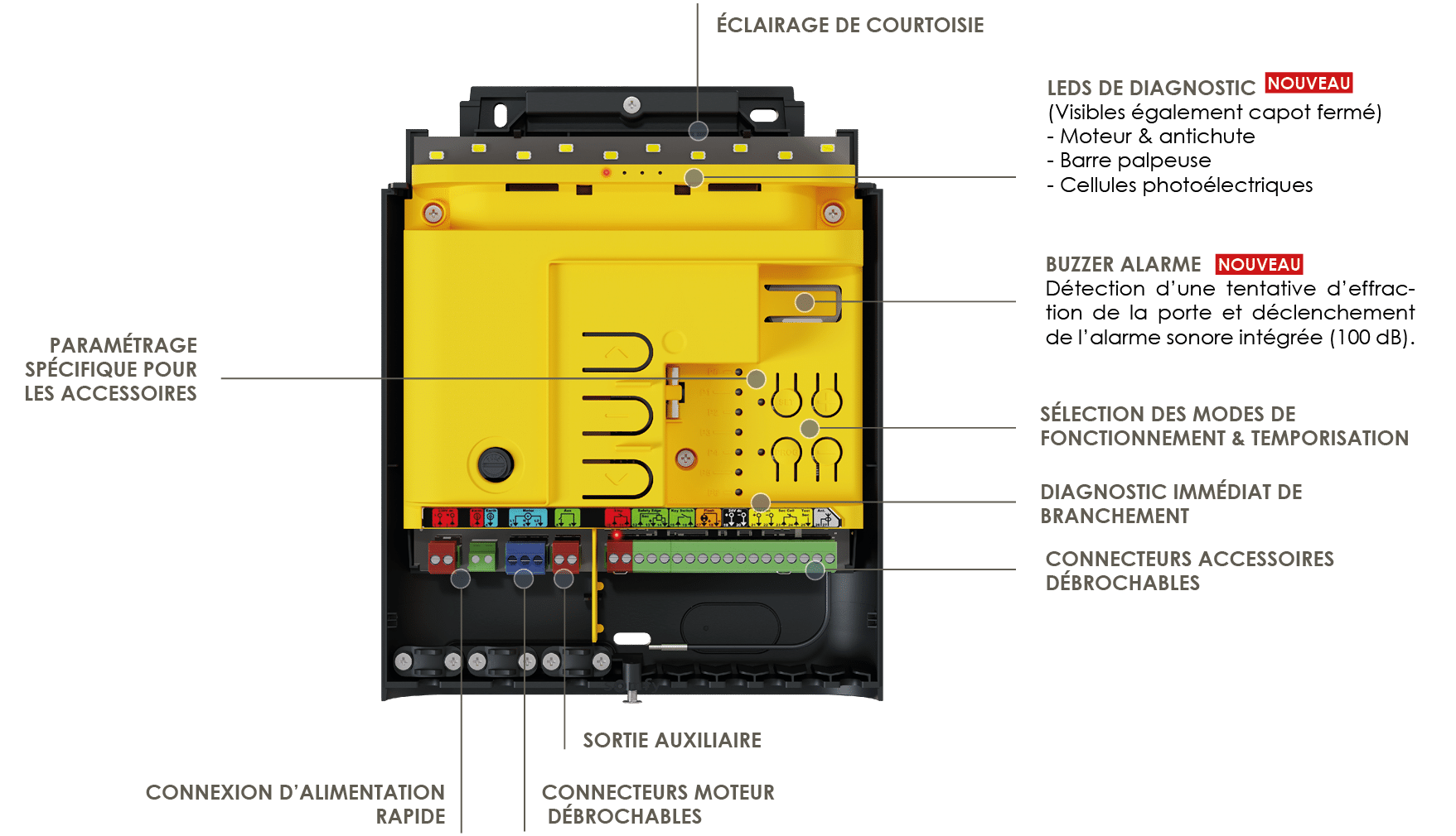 - Câblage d’entrée clairement identifié (autocollant de couleur et fiche : moteur / barre palpeuse/ frein de sécurité)