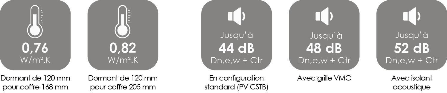0.76W/(m².K) avec dormant 120mm et coffre 168mm, jusqu'à 52 dB Dn,e,w + Ctr avec isolant acoustique.